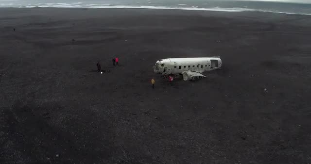 ICELAND – SEPTEMBER 2016 : Aerial shot over plane wreckage on black beach with people and black desert in view