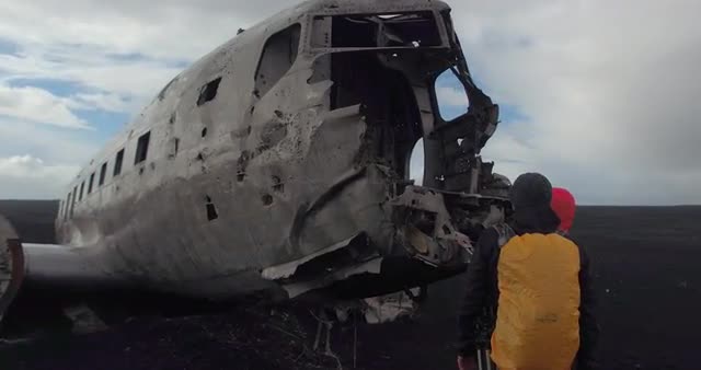 ICELAND – SEPTEMBER 2016 : Video shot of couple looking at plane wreckage on black beach on a beautiful day