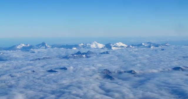 > Aerial shot of Mount Cook flying over clouds on a beautiful day