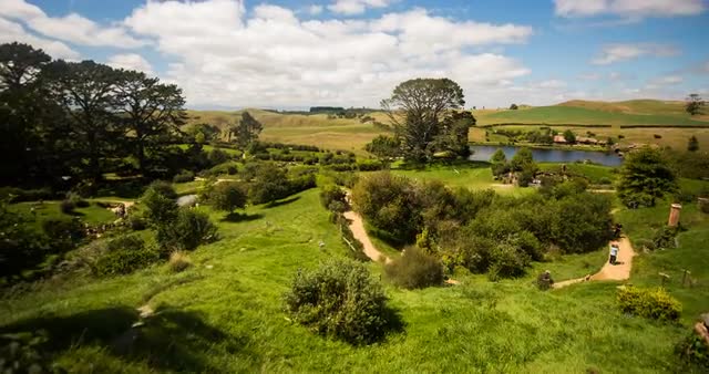 > Moving timelapse / hyperlapse of Hobbiton landscape on a sunny day