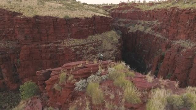 Aerial view flying past man overlooking gorge in Karijini NP