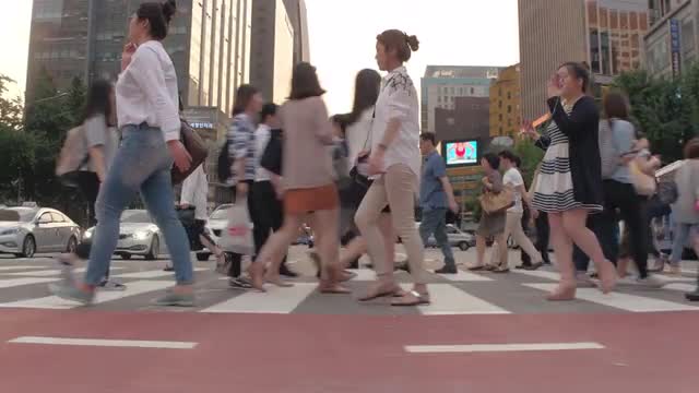 Video shot of people crossing main street at sunset in Seoul