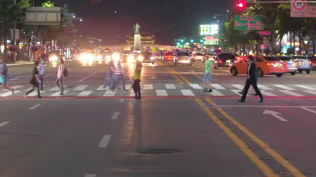 SEOUL, SOUTH KOREA – JULY 216 : Video shot of people crossing main street at night with traffic and tall buildings in view