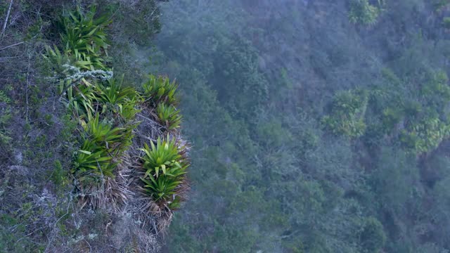 Fog blowing past bromeliads on forest cliff, tele profile