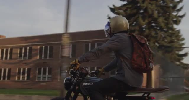 Motorcyclist riding through the city at sunset