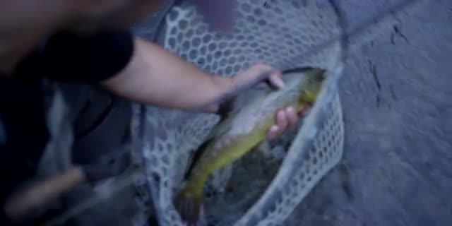 Fish caught and in net after fly fishing