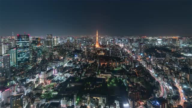 > Tokyo, Japan, Timelapse - Tokyo's skyline from at night from the Mori Museum Wide Angle