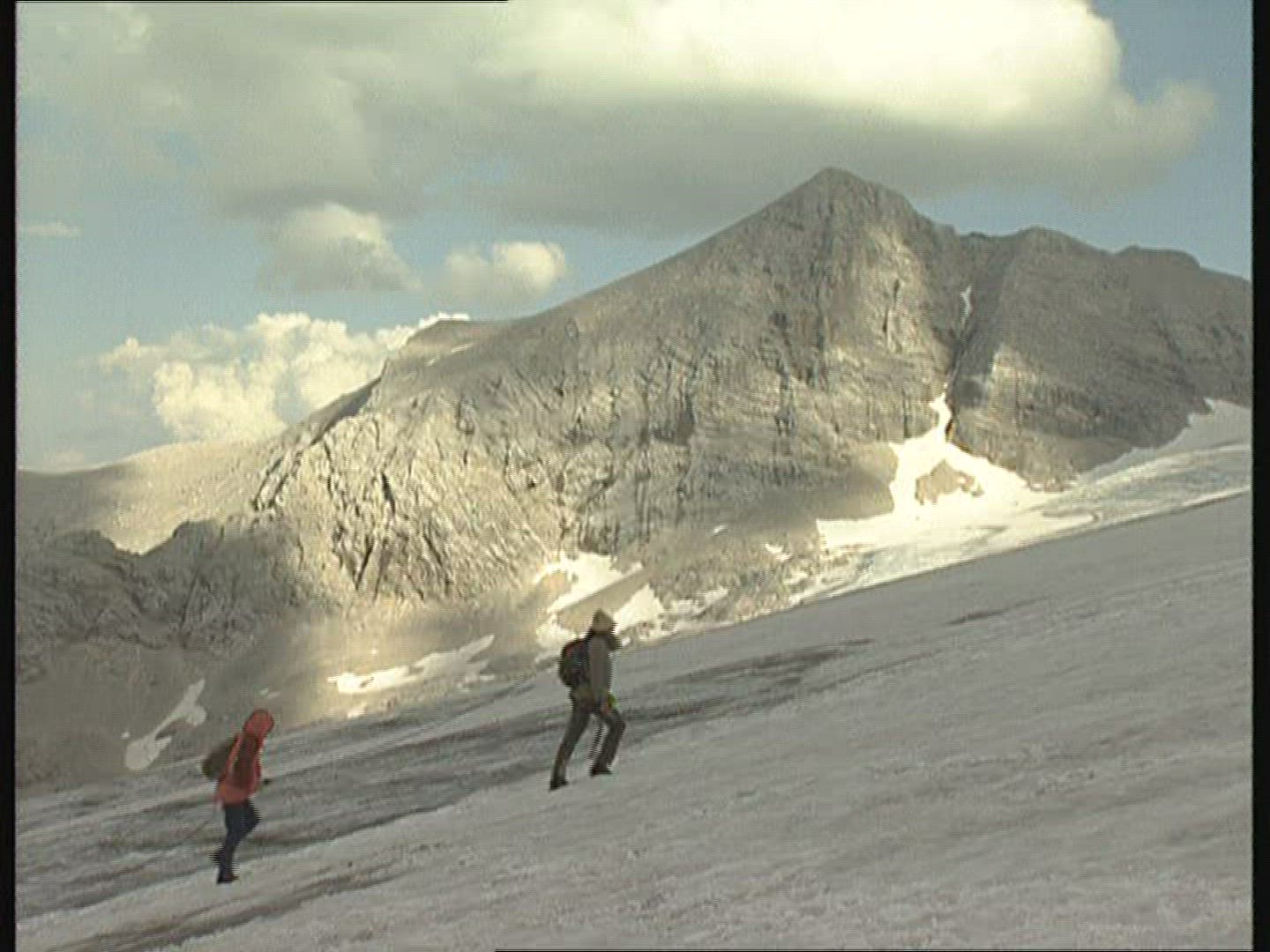 > Timelapse shot of red clouds flowing on the snowy peaks at sunset, Julian Alps in Slovenia, Europe