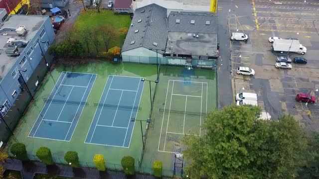 Cap-d'Ail, France - May 18, 2018: Aerial View Of Four Luxurious Tennis Courts And Players Are Playing Tennis On Court At Tennis Club de Monaco, French Riviera, Europe - DCi 4K Resolution