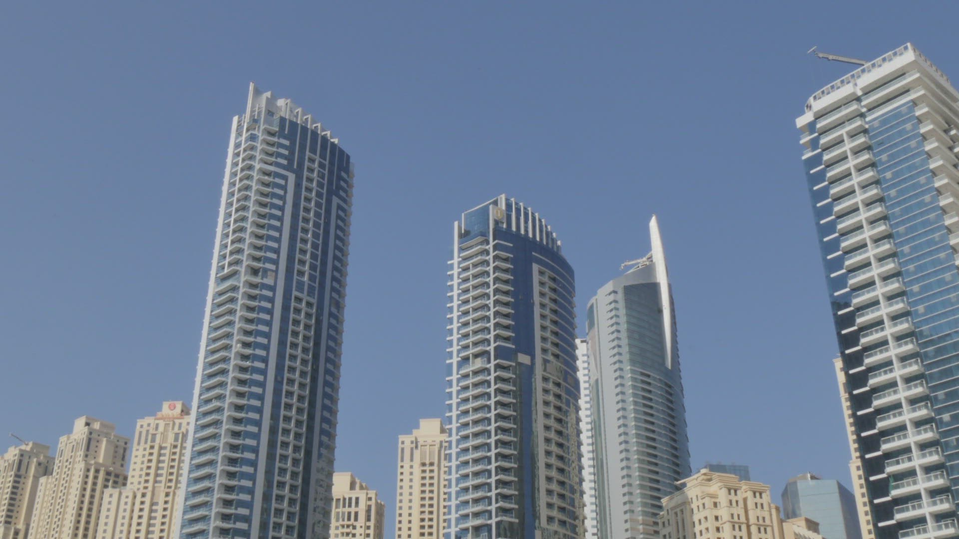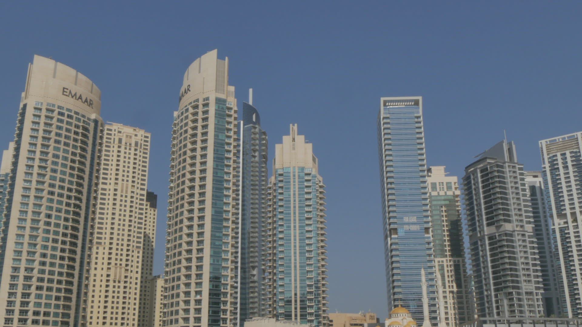 4K UltraHD Timelapse in Dubai, United Arab Emirates. White mosque among skyscrapers in the harbor area of Dubai Marina