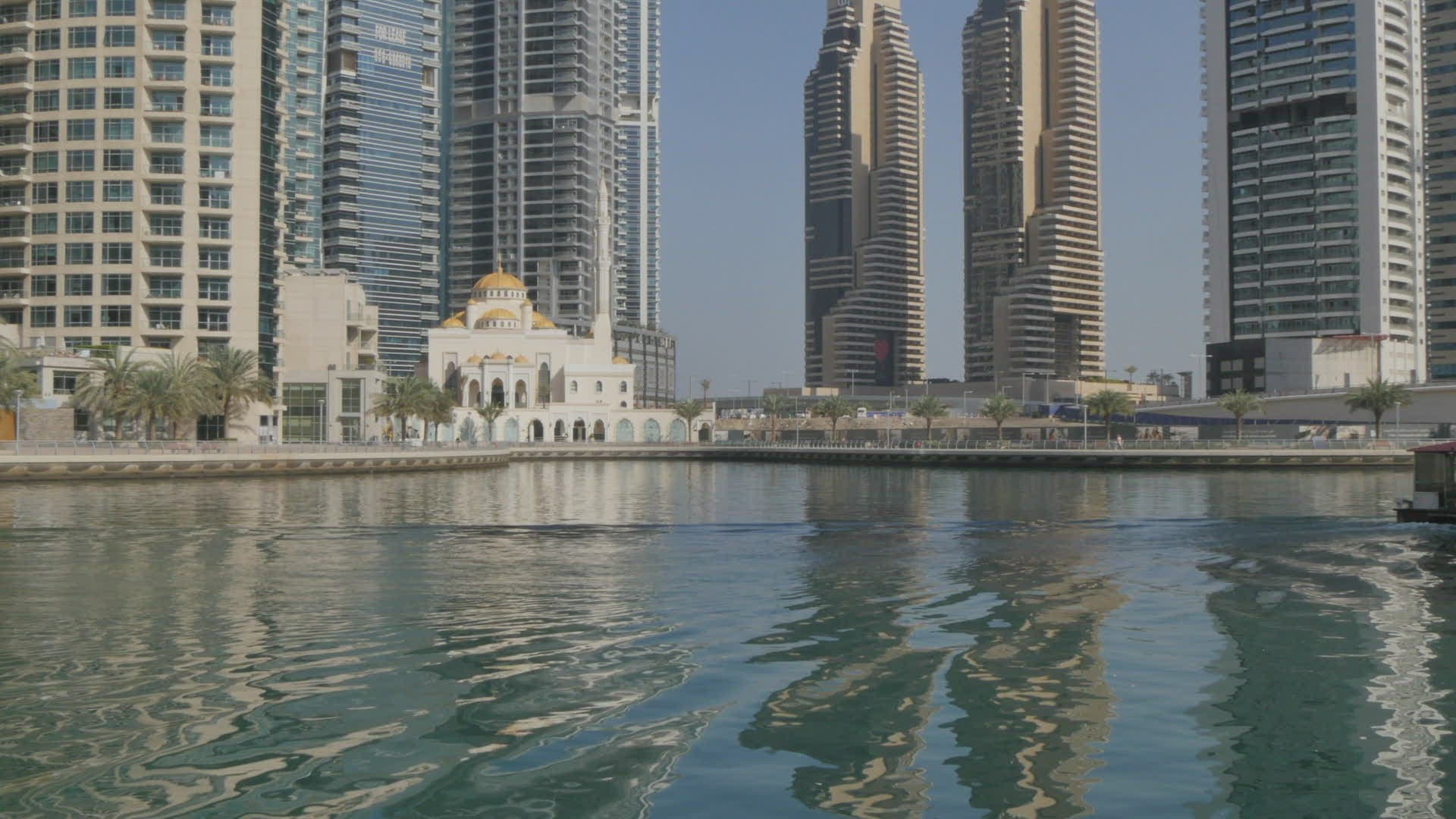 > White mosque among skyscrapers in the harbor area of Dubai Marina