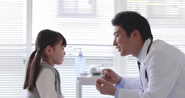 > Japanese doctor visiting young girl patient