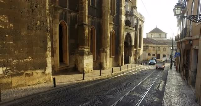 Video shot in central Lisbon at sunset with traffic and people