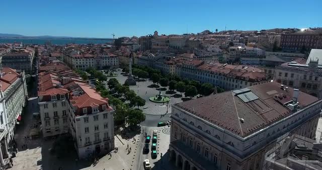 Aerial shot of Rossio Square on a sunny day with blue sky and cityscape