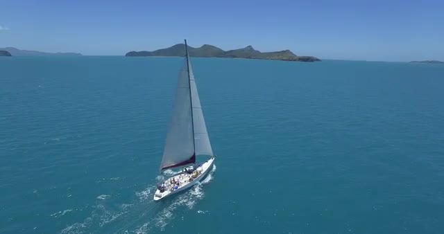 WHITSUNDAY ISLANDS – FEBRUARY 2016 : Aerial shot of sailing boat pulling motorboat on a beautiful day with open ocean in view