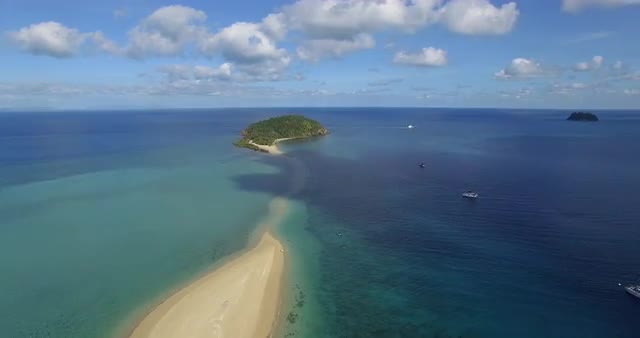 WHITSUNDAY ISLANDS – FEBRUARY 2016 : Aerial shot over beautiful island on a sunny day with boats and ocean in view