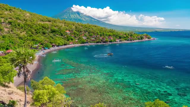 Time-lapse the boats floats in the bay amed on background Agung volcano in Bali, Indonesia. 4K Timelapse in Bali Island, indonesia