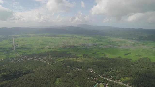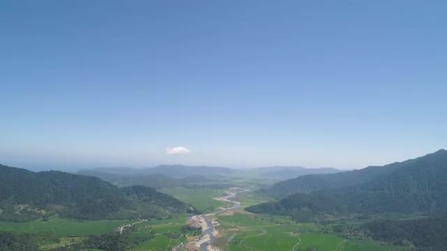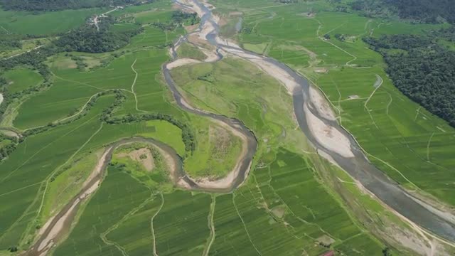 Parched mountain river river among the farm fields in the mountainous province Philippines, Luzon.Drought. Aerial view: relief of mountain valley with river.