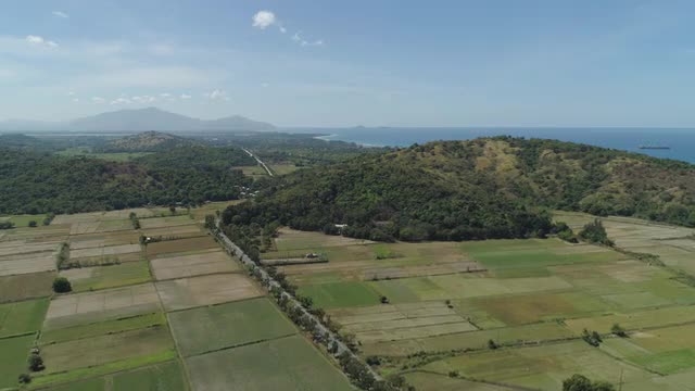 Aerial view of Tropical landscape with farmlands, rice terrace, trees near the sea against the background of mountains, Philippines,Luzon.