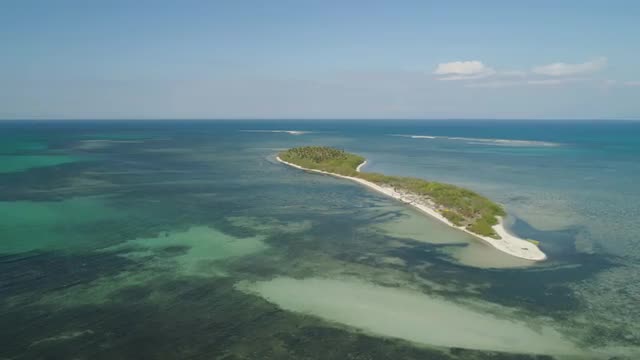 Tropical island with white sandy beach. Aerial view: Magalawa island with colorful reef. Seascape, ocean and beautiful beach paradise. Philippines,Luzon. Travel concept.