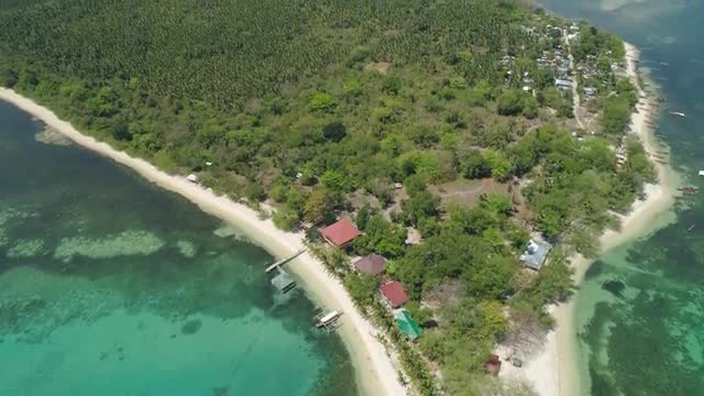 Tropical island with white sandy beach. Aerial view: Magalawa island with colorful reef. Seascape, ocean and beautiful beach paradise. Philippines,Luzon. Travel concept.