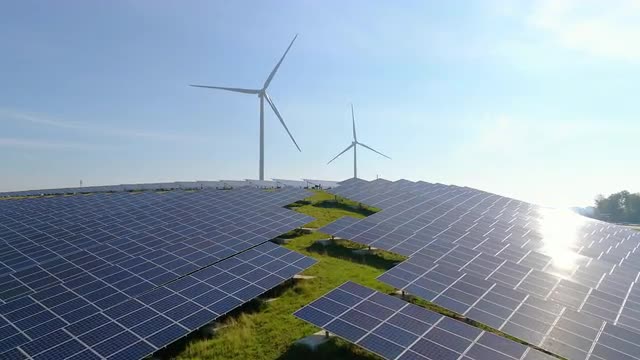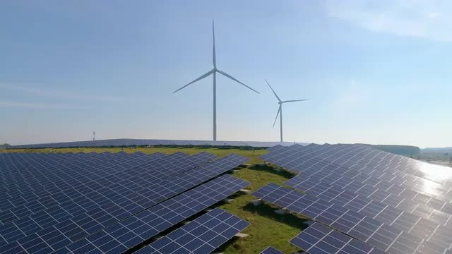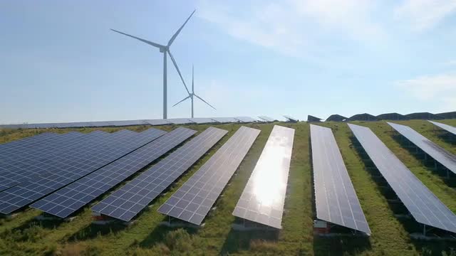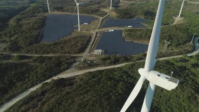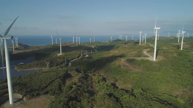 Aerial view of Windmills for electric power production on the seashore. Bangui Windmills in Ilocos Norte, Philippines. Solar farm, Solar power station. Ecological landscape: Windmills, sea, mountains.