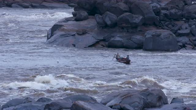 > Two men paddle a canoe through the rapids_4k60.mov