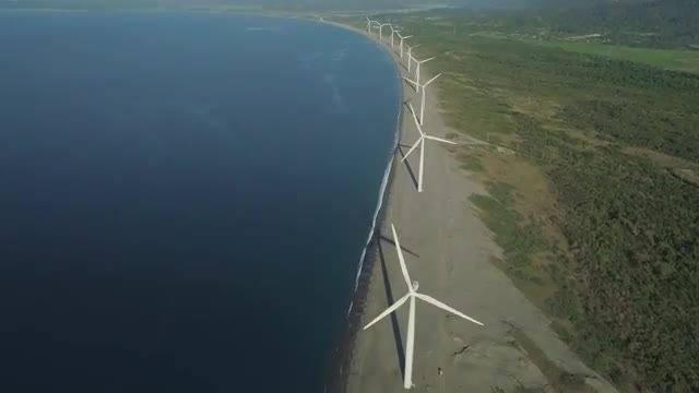 Aerial view of Windmills for electric power production on the seashore. Bangui Windmills in Ilocos Norte, Philippines. Ecological landscape: Windmills, sea, mountains. Pagudpud