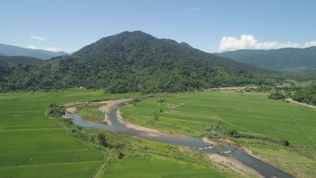 Mountain valley with river, farmland, rice fields. Aerial view of Mountains with green tropical rainforest, trees, jungle with blue sky. Philippines, Luzon.