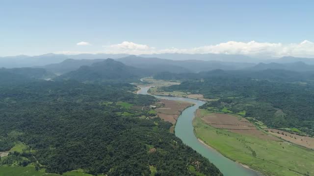 River in mountain valley flowing through farmlands. Aerial view of Mountains with green tropical rainforest, trees, jungle with blue sky. Philippines, Luzon.