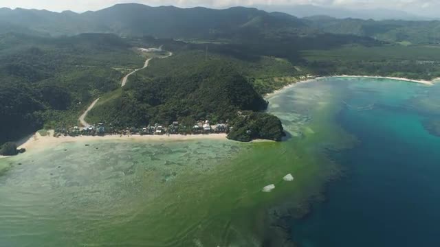 Aerial view of beautiful tropical beach with turquoise water in blue lagoon, Anguib, Philippines, Santa Ana. Ocean coastline with sandy beach, coral reefs. Tropical landscape in Asia.