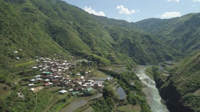 Aerial view of rice terraces and agricultural land on the slopes of the mountains. Village of farmers near rice fields in mountain valley. Mountains covered forest, trees. Cordillera region. Luzon, Philippines.