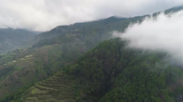 Aerial view of rice terraces and agricultural land on the slopes of the mountains. Mountains covered forest, trees. Cordillera region. Luzon, Philippines.