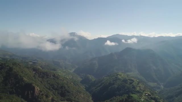 Aerial view of rice terraces and agricultural land on the slopes of the mountains. Mountains covered forest, trees. Cordillera region. Luzon, Philippines.