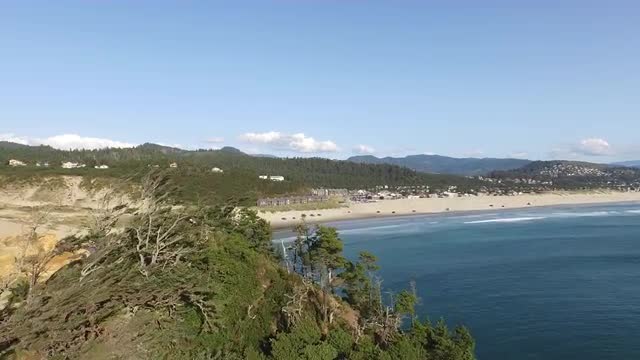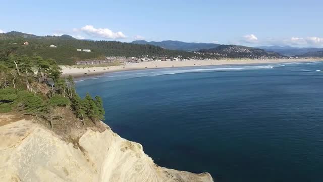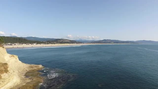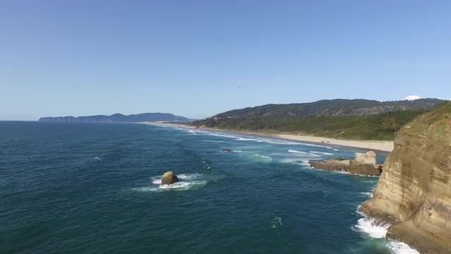 Wide aerial shot of coast line and waves along Oregon Coast