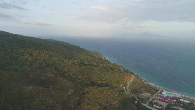 Aerial view of coast of the island at sunset. seascape, shore, sky at sunset time. Tingloy, Philippines, Luzon. Travel concept.