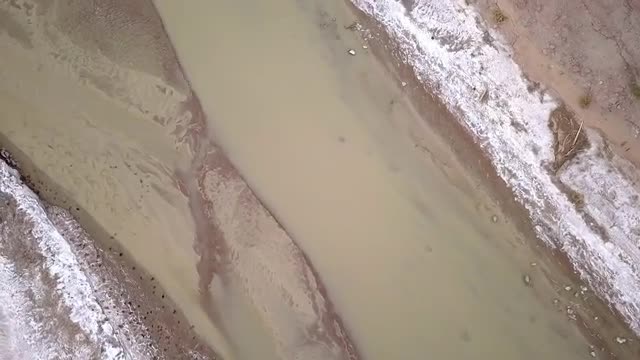 Aerial view flying over muddy river in the desert viewing sand bar and mineral deposits.