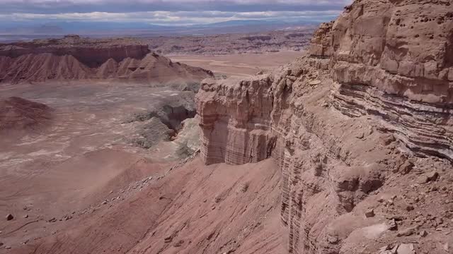 Flying over the desert landscape near Goblin Valley viewing the red rock terrain in Utah.