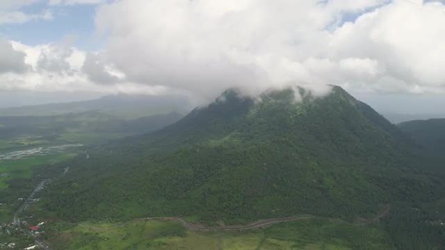 Aerial view of mountains covered forest, trees in cloudy weather, Bulusan Volcano. Luzon, Philippines. Slopes of mountains with evergreen vegetation. Mountainous tropical landscape.