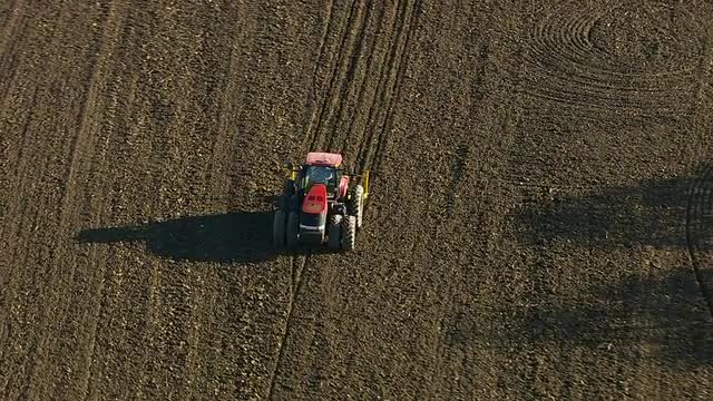 Aerial view of tractor plows the agricultural land for sowing. Plowing farming land.