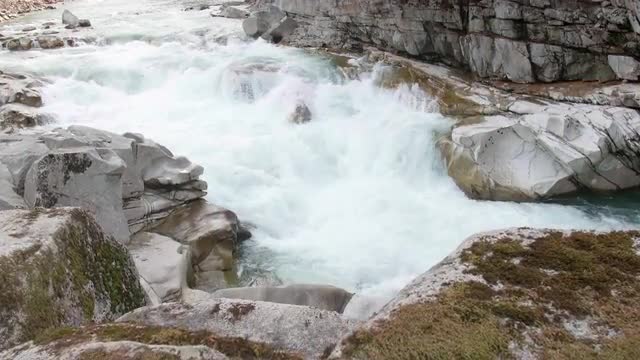 River in Banff | Rapid Flowing Water Framed by Forest & Mountains Range | Wide Shot