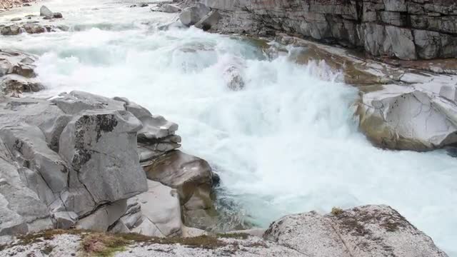 > River in Banff | Rapid Flowing Water Framed by Forest & Mountains Range | Wide Shot