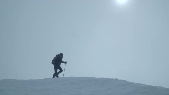 > Woman walking by the ridge of a snowy mountain