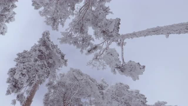 Sky through freezed trees in winter forest. Nature background