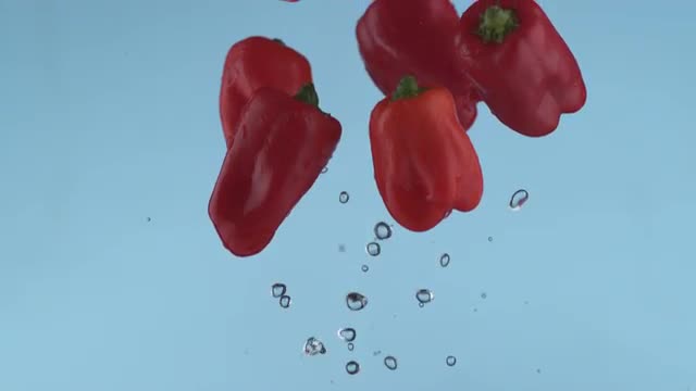 > Red peppers flying in slow motion, shot with Phantom Flex 4K at 1000 frames per second