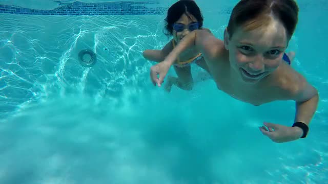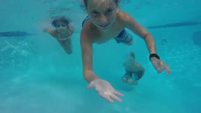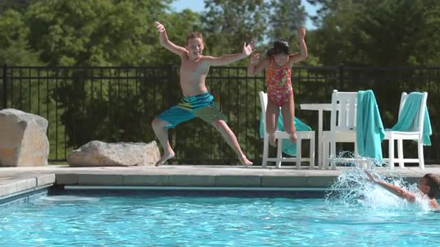 > Boys having squirt gun fight in pool, super slow motion