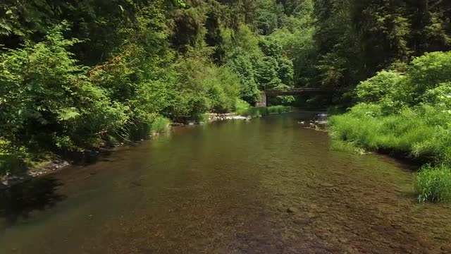 > Flying over a creek with bridge, Oregon, USA