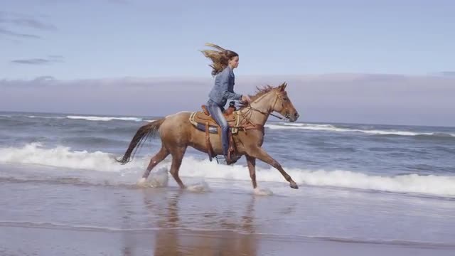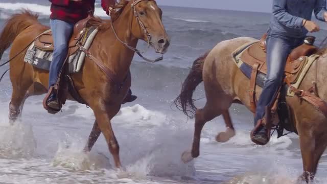 > Women riding horses at beach in slow motion