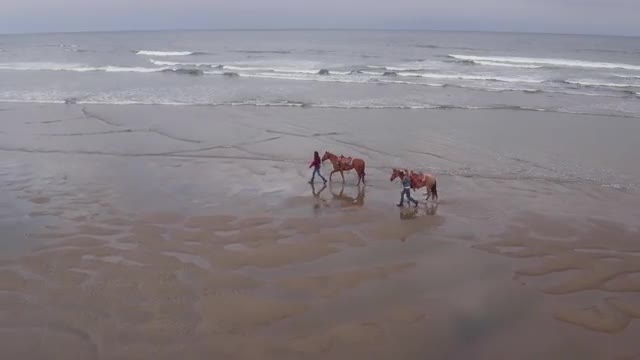 > Aerial view of women riding horses at beach
