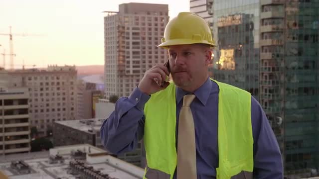 > Two construction supervisors look at plans on rooftop